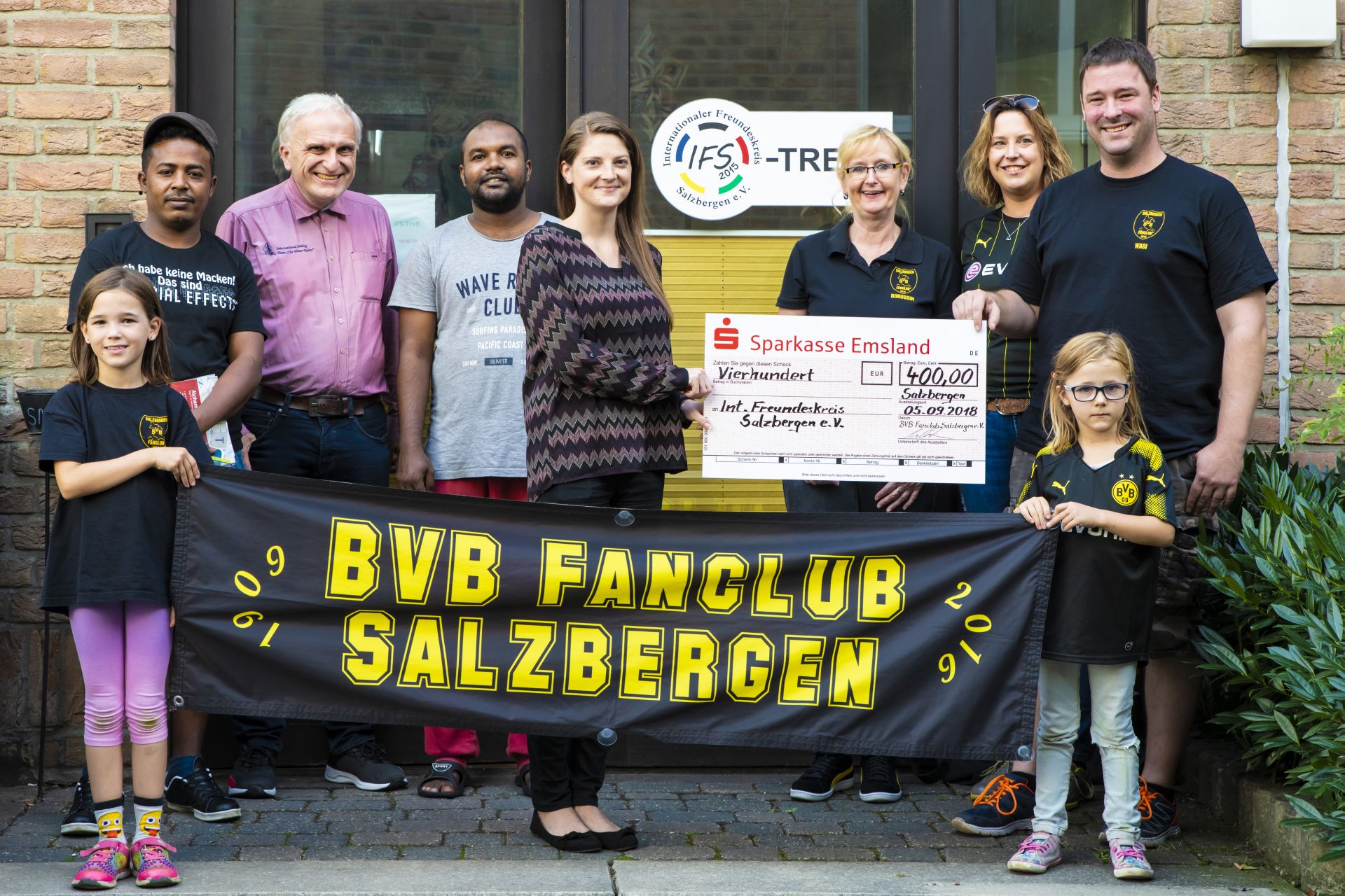Der BVB Fanclub Salzbergen e.V. hat uns am 05.09.2018 eine Spende über 400 Euro überreicht. Wir freuen uns sehr über die Spende, vor allem weil die Spendenbereitschaft in den letzten Jahren stetig nachgelassen hat, aber die Flüchtlinge unsere Unterstützung weiterhin dringend benötigen. Wir setzen die Spende für verschiedene Projekte ein, unter anderem für die Sprachförderung. Viele Flüchtlinge können zwar inzwischen gut Deutsch, die Integration ist dann allerdings noch nicht abgeschlossen. Dieses Jahr haben mehrere Geflüchtete eine Ausbildung begonnen. Hierbei unterstützen wir sie beispielsweise beim Kauf von Büchern und Lernmaterial. Für den täglichen Nachhilfeunterricht von Dr. Möller werden ebenfalls Bücher angeschafft. Außerdem übernehmen wir Prüfungsgebühren für Schüler, die an einem normalen Integrationskurs nicht teilnehmen dürfen oder für diejenigen, die nach dem B1 Kurs freiwillig weiterlernen möchten, um die Qualifikationen für ein Studium zu erreichen.
