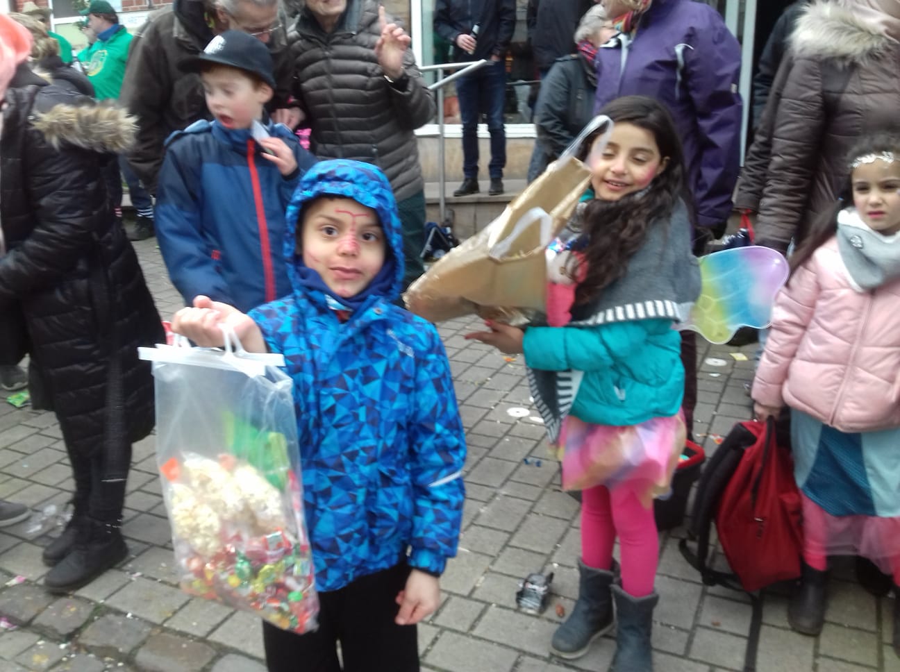 Karneval1Am Rosenmontag versammelten sich 23 Flüchtlingskinder um 14:45 Uhr am Sportplatz des SVA und fieberten dem Nachmittag entgegen. Begleitet wurden sie von 11 ihrer Mütter, Väter und Tanten sowie einigen Integrationslotsen.